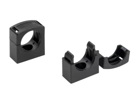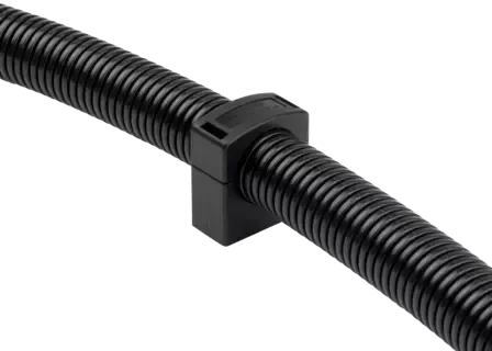 UHE-держатель представляет собой цельный держатель гофрированной трубы, в котором крышка соединена с держателем пленочной петлей. Он изготовлен из специально модифицированного полиамида. Держатель служит для крепления защитных шлангов для проводов на промышленных установках и машинах. Держатели UHE имеют следующие преимущества:. Быстрый монтаж благодаря креплению в одном отверстии. Защитные шланги просто защелкиваются в держателе, поэтому он подходит для монтажа над головой. Оптимальное соединение шланга с держателем благодаря двойной перегородке.