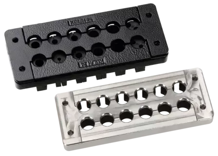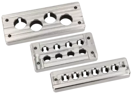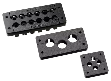 2-х или 3-х компонентная рама. Простой монтаж. Высокая плотность прокладки до 48 строк. Встроенная разгрузка от натяжения. Подходит для стандартных вырезов для 24- и 16-полюсных промышленных разъемов и двух специальных размеров (однорядная и круглая M50). Подходящая втулка для кабельного ввода: KDT/X.