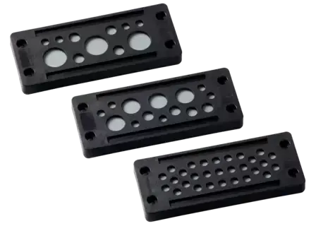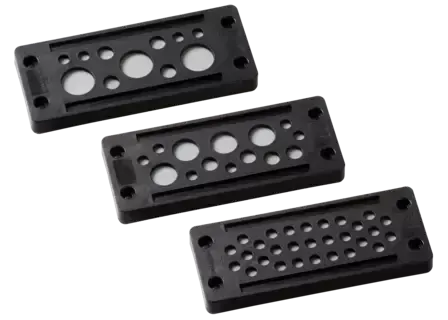 Плита с кабельными вводами из пластмассы с функцией защелкивания и одной эластомерной пластиной вместо двух. Рациональный способ подключения без использования инструмента для кабельных соединений машин и установок. Альтернатива резьбовому кабельному вводу. Очень хорошее снятие натяжения.